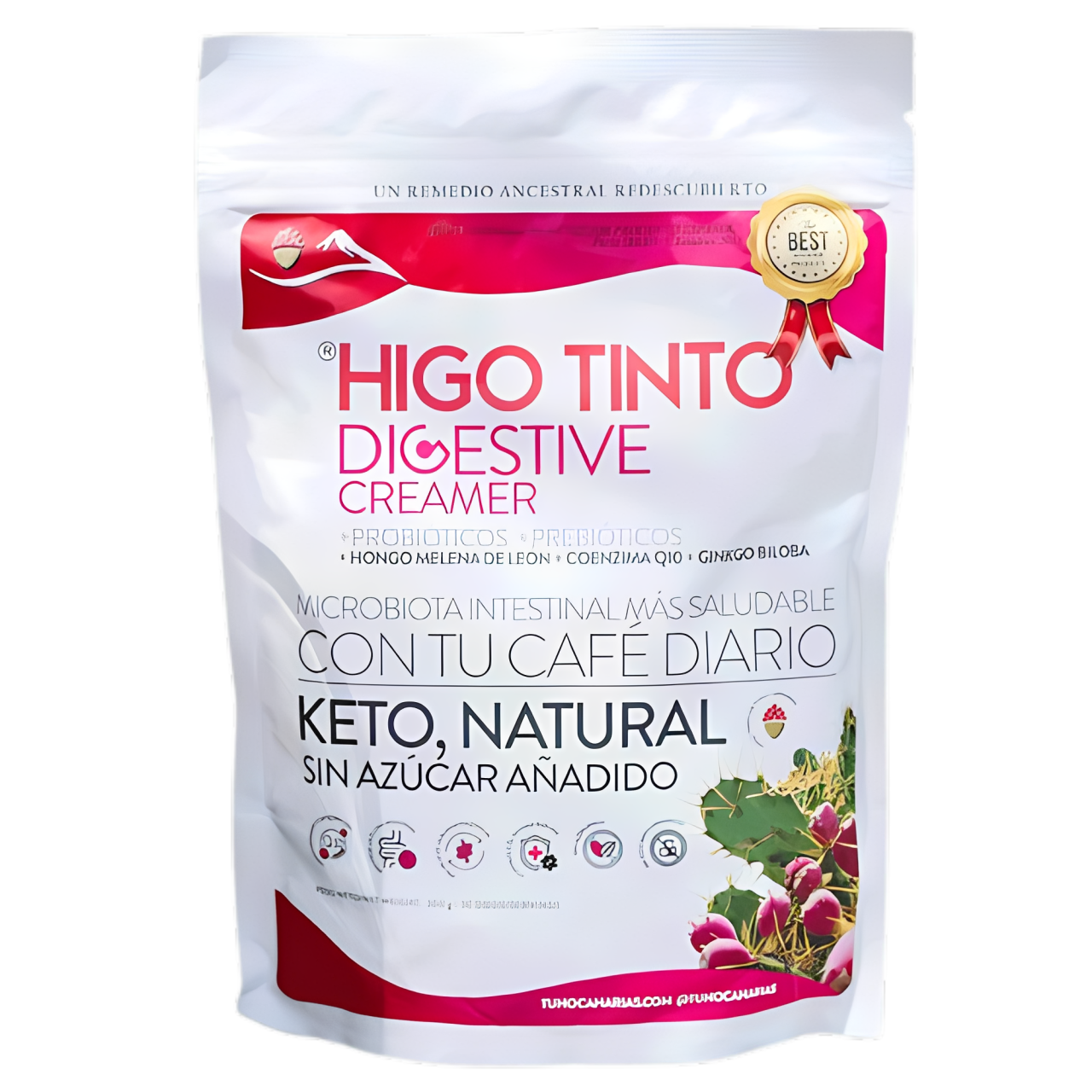 El HIGO TINTO® Digestive Creamer es un concentrado alimenticio en polvo que combina ingredientes naturales como Higo Tinto®, Inulina de Achicoria, TCMs del Coco, probióticos y Coenzima Q10. Está diseñado para mejorar la salud digestiva, aumentar la energía y apoyar la salud cardiovascular.